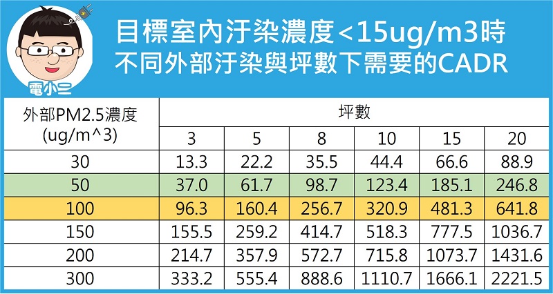 而影響室內最終汙染濃度的參數很多,關於具體計算與假定,小二曾寫過這篇:房間開了清淨機後,汙染濃度會變成多低?,有興趣的客倌可以前往參考,這邊只講結論:假設你目標是讓室內保持在15以下的相對乾淨程度,理論上不同坪數/室外汙染狀況需要的CADR如同下表: