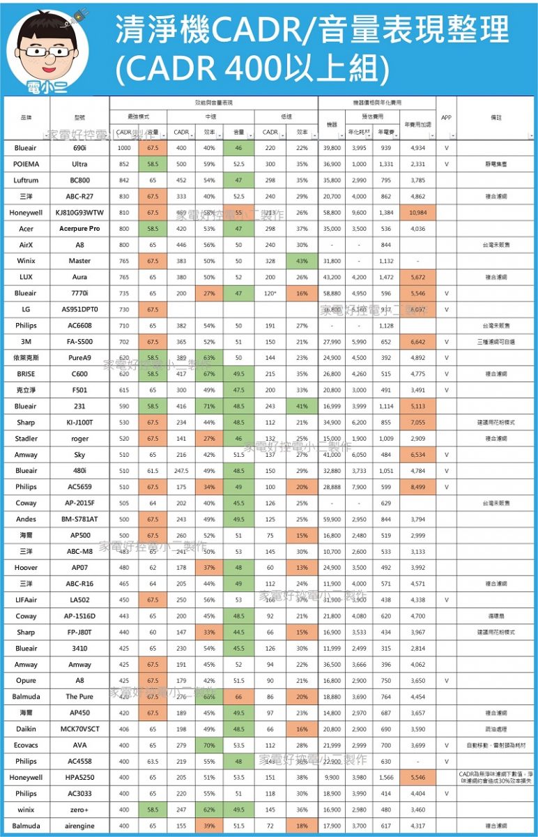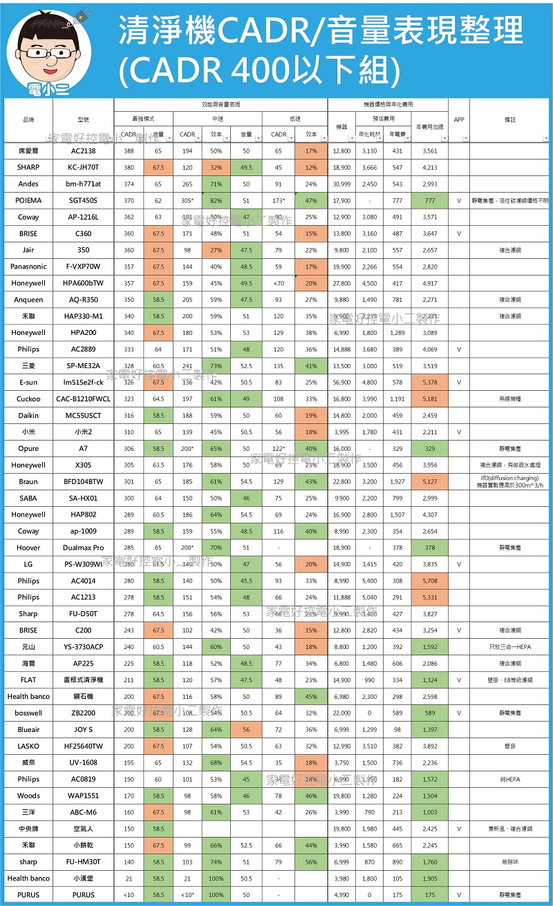 扣除一些太久以前測,數據遺失沒保存到的以外,這邊是小二大約其中90台實測文的數據整理,每台都有對應的實測文可以去看當初的實測紀錄,也因為表格大太,所以小二今年得拆成兩張了,先以CADR 400作為分界(約12坪適用),也請各位廠商或媒體高抬貴手,引用前先跟小二確認一下是否引用失當啊…