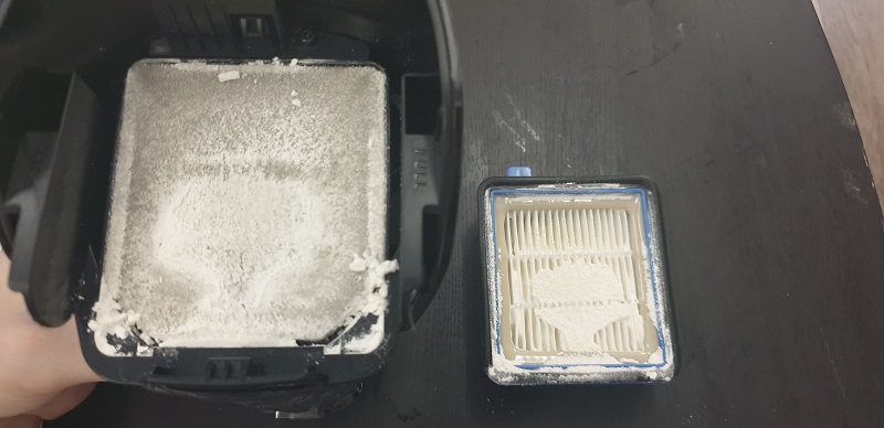 後方的濾網可以看到雙層海綿濾網並無法完全的阻擋住,還是有不少粉塵跑到更後方的HEPA濾網這邊,所以一般使用也會建議一年還是換個一次濾網