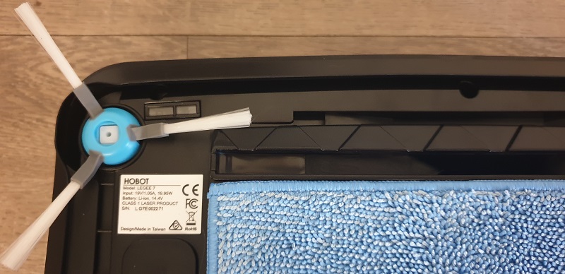 最前方可以看到有防墜落偵測,另外清掃機制是由邊刷把髒污掃入至吸口吸入,Legee一直使用無滾刷的設計(應是因為機器本身尺寸有限),以結果論來看,這樣讓機器本身沒有卡毛的問題,但同樣會因此犧牲掉一些對於不平整地面的清掃效果,不過因為至少後方還有乾擦布輔助,所以對帶黏性細粉塵(例如麵粉)即使沒能全部吸掉,還是有一定的清潔表現