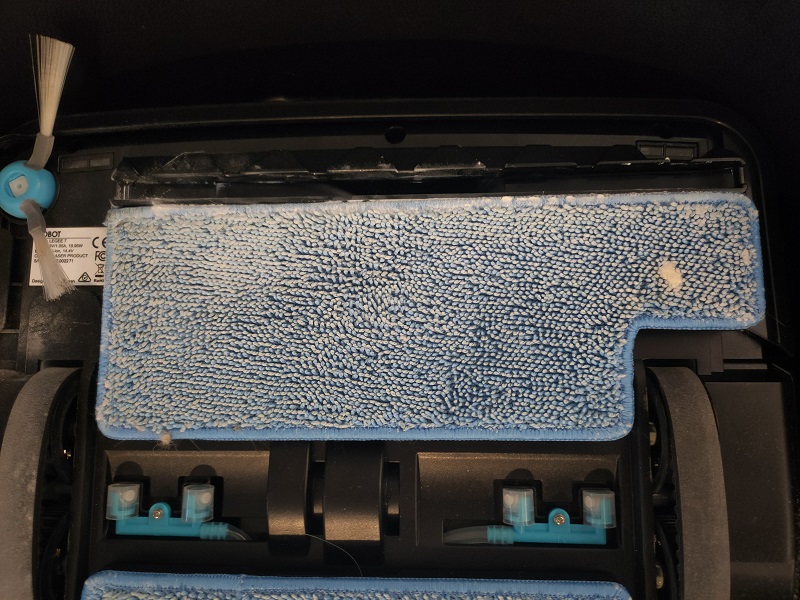 後方則是原則上比照前代的噴水裝置,以及濕擦的布,而機器正面以個人觀察,並沒有再額外放偵測裝置,除了上方的雷射頭看9cm左右的高度外,就是直接透過前方碰撞感應去做判斷,這點建議可以改善一下,放一組基本的紅外線偵測也行,對於低矮障礙就會有更高機會提前偵測到並減速