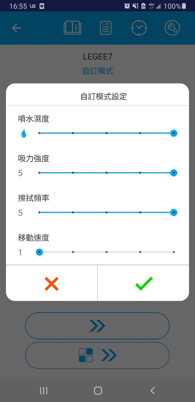 • 自訂模式則就是自行設定噴水/擦拭頻率/吸力(音量)/移動速度,原則上不趕時間都建議移動速度調最慢;擦拭頻率調最高;噴水要嘛不噴乾擦,要嘛噴到爆;吸力人在調小不在調大