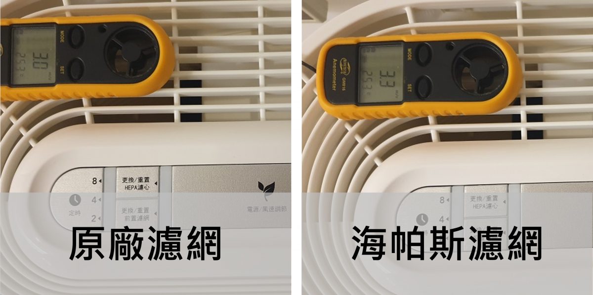 濾網沒有問題不代表放進機器裡用沒有問題,這是值得一再強調的事情,所以即使濾網報告看起來沒問題,小二還是會用實際機器來測試,首先出風量部份,海帕斯的濾網比起原廠的大約高上10%