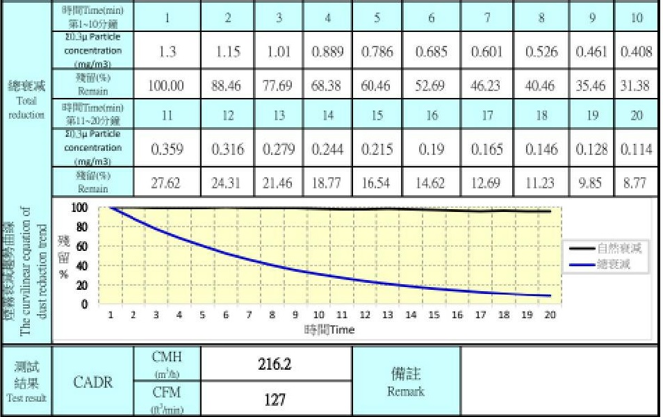 - 濾網報告:由合格機構出具,清楚載明在特定空氣流速/流量下,濾網對於0.3um的過濾效率;以及在此同時的濾網壓損