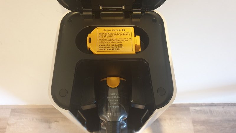 LG吸塵器標配就是2顆電池,所以掀開頂板後可以看到充另外一顆的位置,兩顆加起來可以使用15-60分鐘,不怕掃到一半沒電