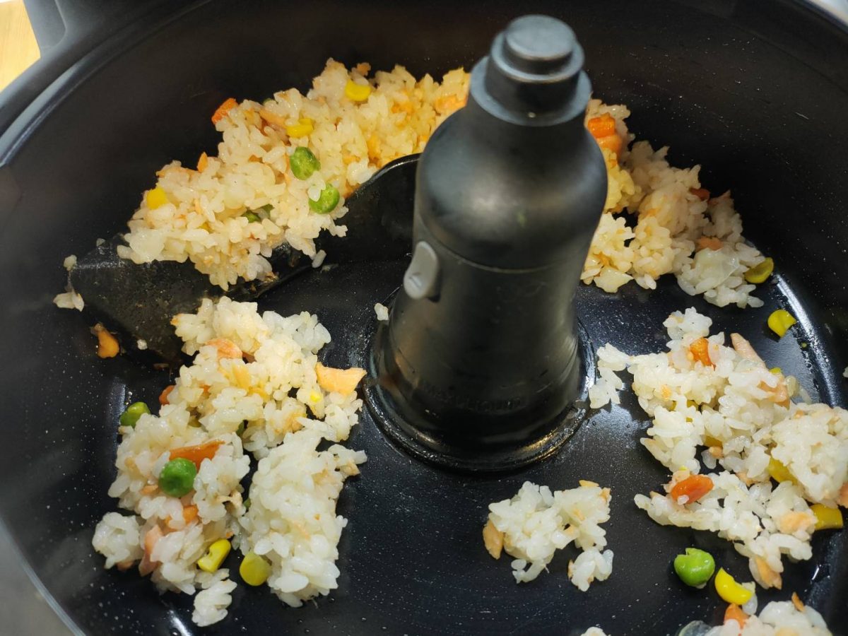 容易沾黏的食材反而會因為被螺旋槳通通推到一起,產生沾黏造成局部不熟。比如說純粹氣炸雞胸肉的話,就很容易發生這個現象。這時直接單純氣炸反而更方便。反之,如果米飯,豆類蔬菜或略帶勾芡湯汁一類,搭配拌炒螺旋槳的成品時表現出色。